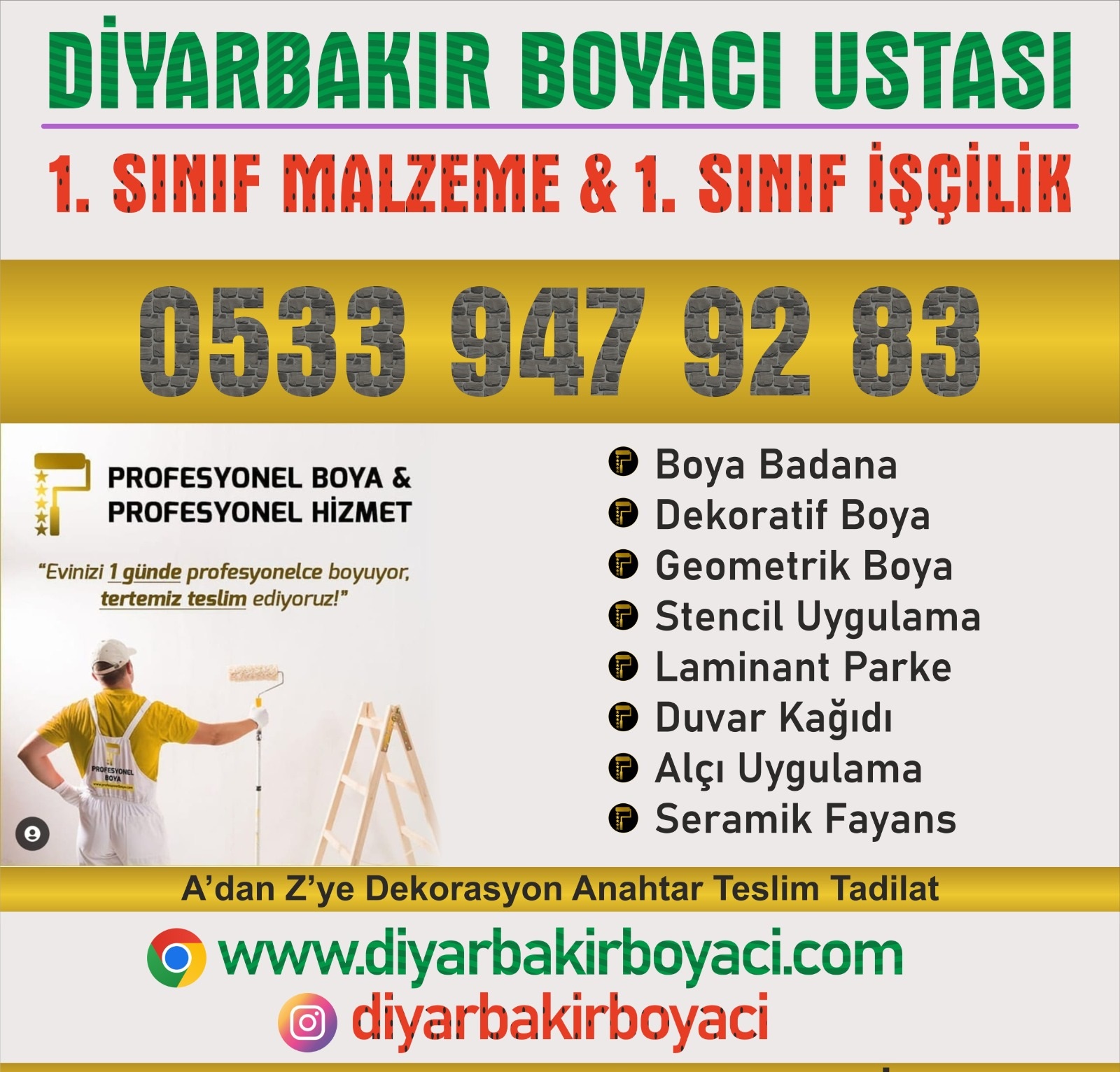 Diyarbakır Kulp boyacı yılların tecrübesi ve hizmet kalitesi ile markalaşmış profesyonel boya badana dekorasyon hizmetleri veren yenilikçi bir firmadır. A’dan Z’ye boya, badana, inşaat, dekorasyon, restorasyon, tadilat, tamirat, iç mimarlık hizmetleri sunmaktayız. Anahtar teslim ev tadilatı dâhil olmak üzere inşaatla ilgili aklınıza gelebilecek tüm işlemler tek kalemde…
